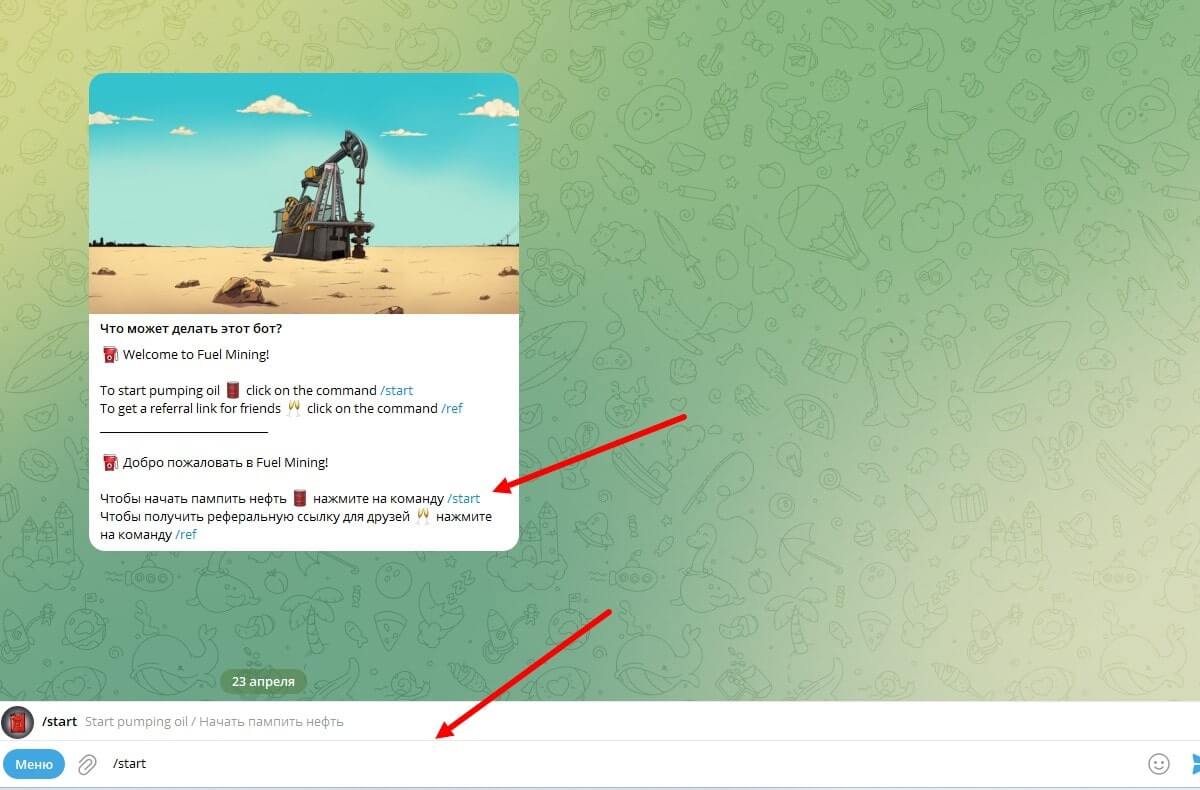Чтобы начать зарабатывать на Fuel Mining– перейдите на страницу бота по ссылке. Затем появится стартовый пост, где рассказано, что может этот бот. Инструкция написана на русском и английском языке. Чтобы запустить игру, нужно написать в сообщении “/start” или нажать на гиперссылку, имеющаяся в тексте с объяснением возможности бота.