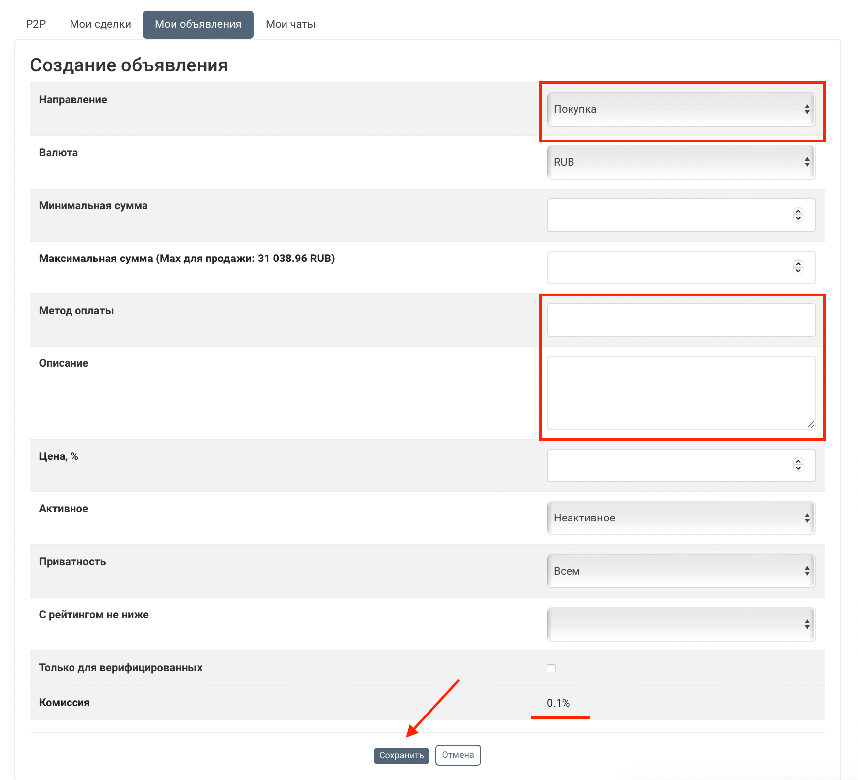 На следующей странице заполняются обязательные требования к предложению, по которым будет проводиться сделка. Мейкеры уплачивают площадке комиссию в размере 0,1% в долларовом эквиваленте и 0,15% в рублях за исполнение своих обязательств. Этот сбор следует учитывать при определении уровня выгодного курса. Рекомендуем внимательно заполнять все предлагаемые поля, в таком случае большинство посетителей сможет без лишних запросов выбирать ваше предложение и оперативно переходить к конверсии.