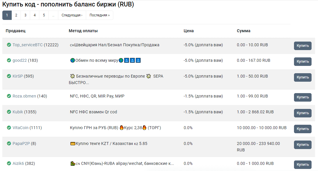 При ведении деятельности тейкера (принимающего другие предложения, то есть рядового приобретателя) достаточно открыть главную страницу платформы и выбрать подходящее объявление. По умолчанию сортировка выдачи происходит по наиболее выгодным с точки зрения взимаемых комиссионных предложениям. Пример актуальной на момент создания материала доски объявлений представлен ниже.