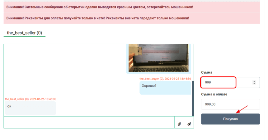 После подтверждения операции согласованный объем средств будет зарезервирован на депозите продавца. Важно провести оплату по указанным в чате реквизитам и не производить переход по внешним ссылкам, в таком случае велик риск потери средств. Далее покупатель подтверждает оплату со своей стороны нажатием соответствующей кнопки.