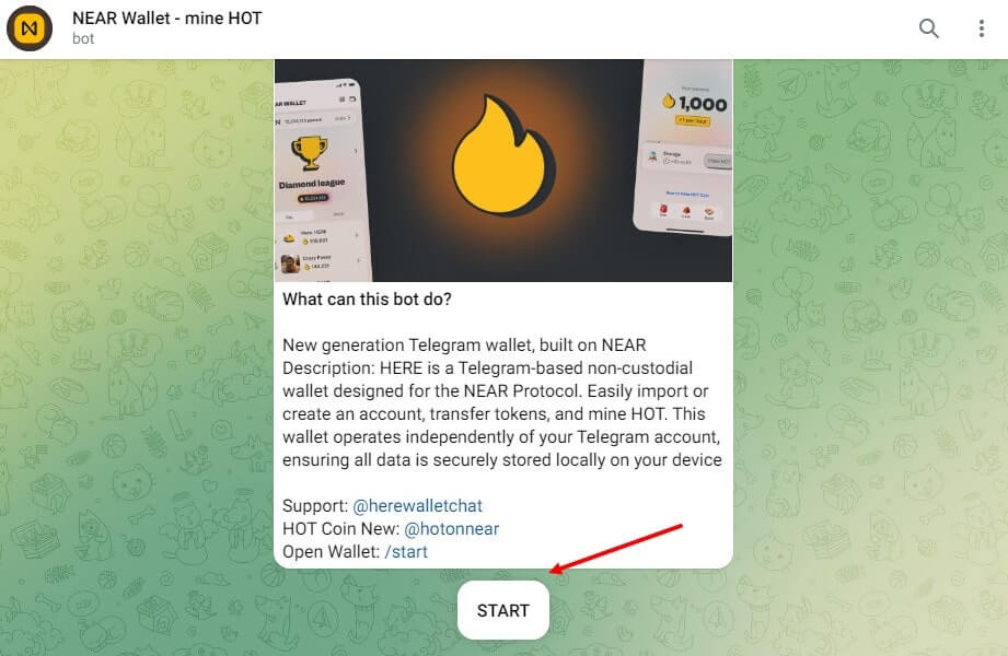 - Доступ к боту NEAR Wallet. Начните с доступа к боту NEAR Wallet в Telegram, нажав на странице бота кнопку “Start”.