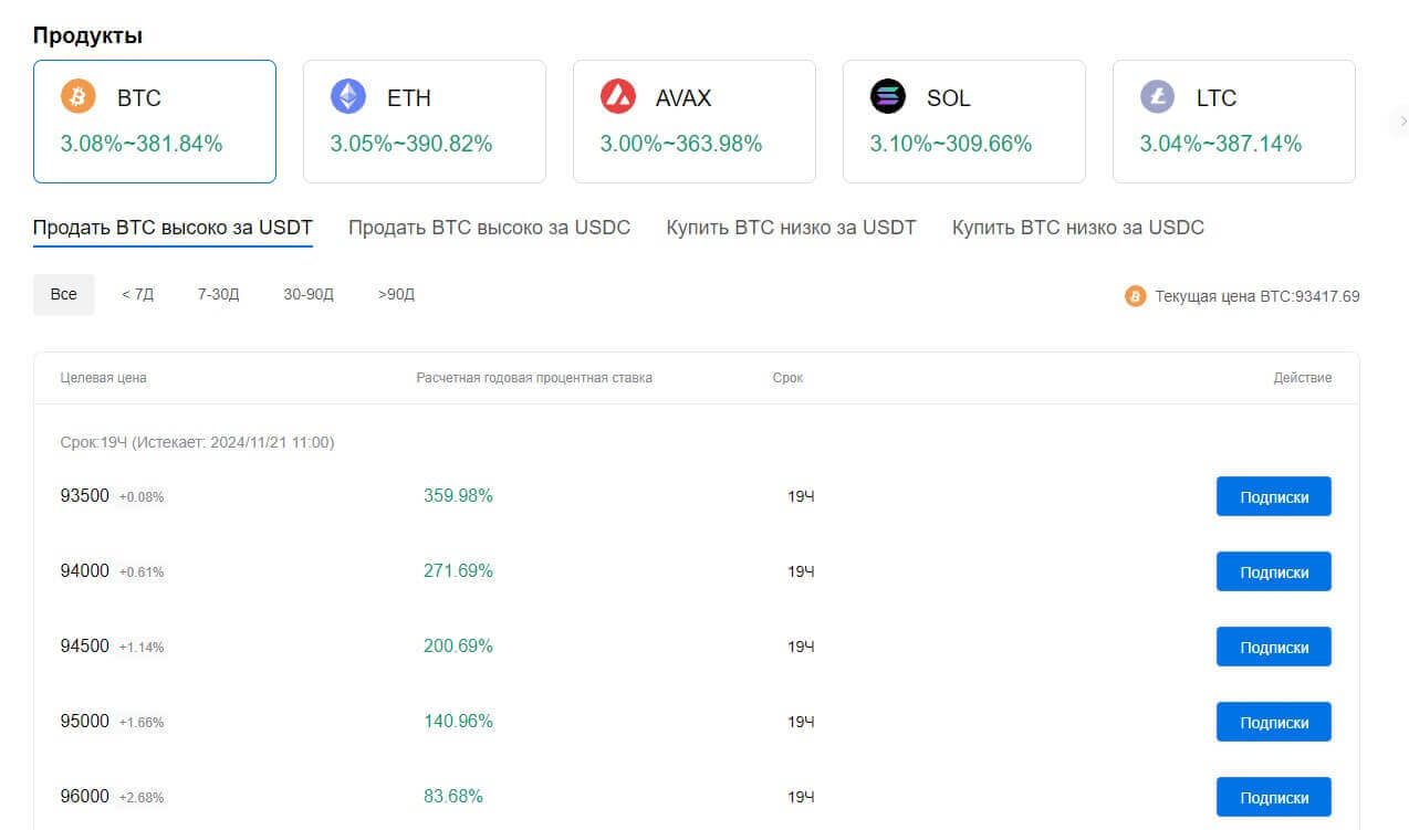 На данный момент система поддерживает 5 криптовалют (BTC, ETH, AVAX, SOL, LTC) и 2 стейблкоина (USDT и USDC). Оформление продукта происходит на период от нескольких часов до 90 дней. Чем выше срок, тем ниже процент, например, если стоимость BTC 91100 USDT, а вы планируете оформить продукт с ценой исполнения в 92 000 с истечением срока через 2 дня, то получите порядка 170%, при этом оформив такой же продукт с исполнением через 3 дня, то процент уменьшается до 155%.