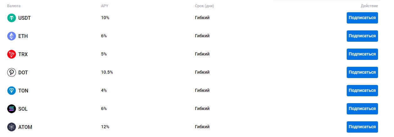 Открывает возможности зарабатывать на новых монетах сразу после их листинга на платформе. Это отличный выбор для тех, кто всегда в поиске новых возможностей и готов вкладываться в перспективные проекты на начальном этапе. По таким продуктам биржа предлагает самые высокие проценты – от 50 до 100 процентов годовых на сроки от 7 до 180 дней.