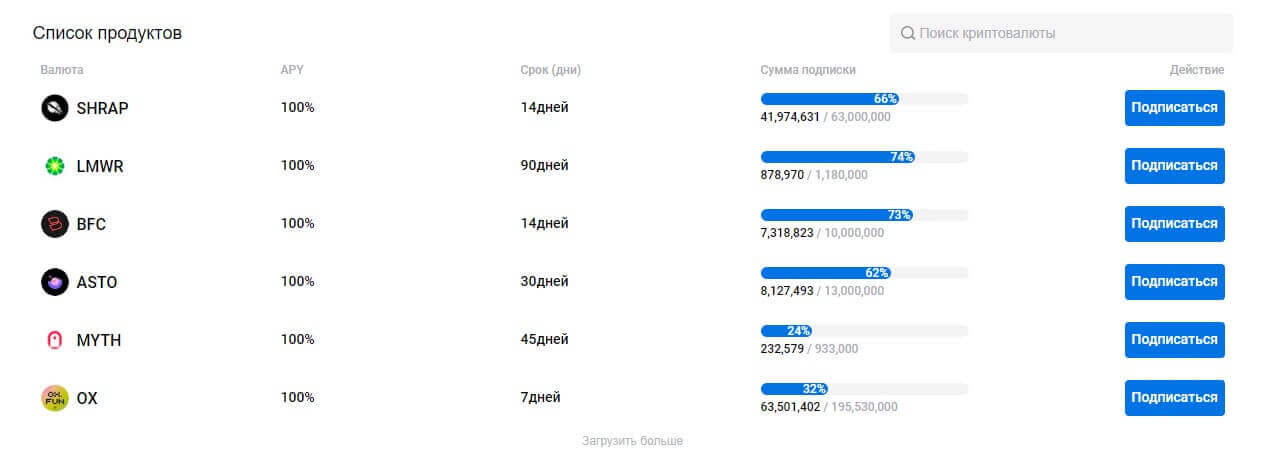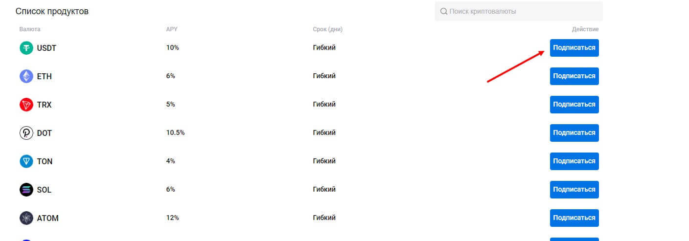 - Выберите токен и укажите сумму. В списке будет представлено множество криптомонет, в которые можно вложится. Рядом с инструментом нажмите на кнопку “Подписаться”.