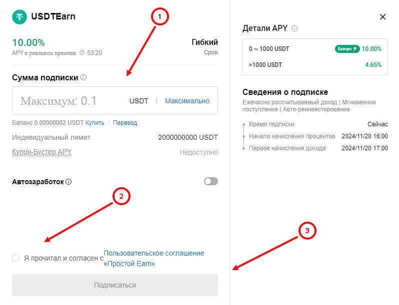 - Откроется окно, где нужно указать сумму (количество монет), прочитать и согласится с пользовательским соглашением “Простой Earn” и нажать на кнопку “Подписаться”.