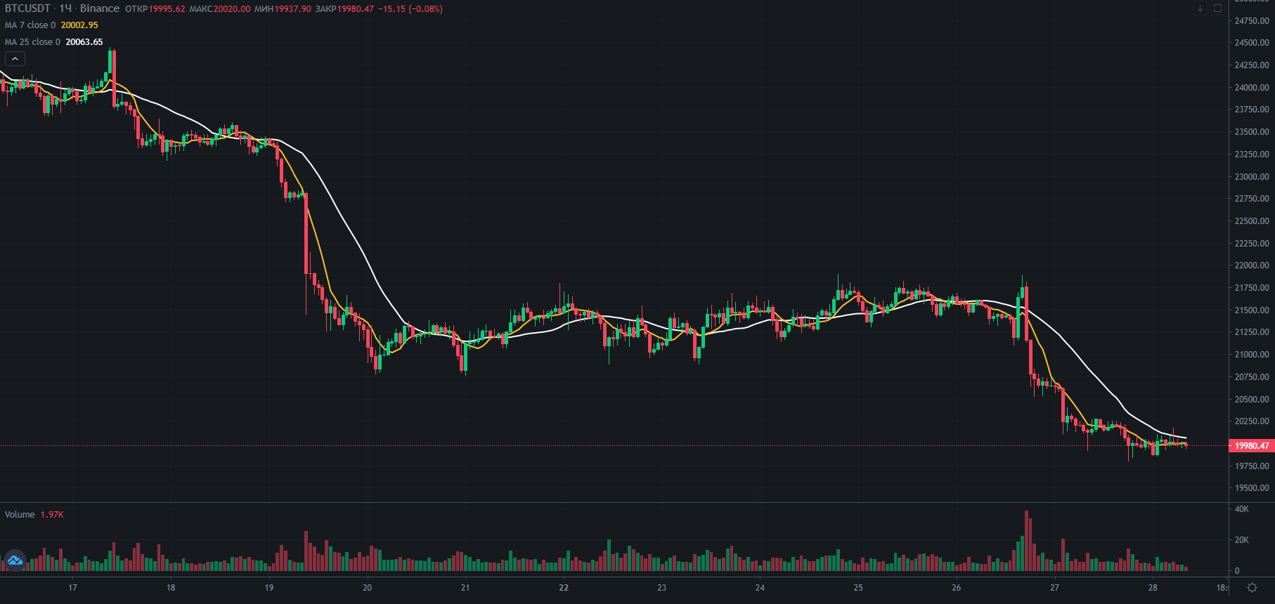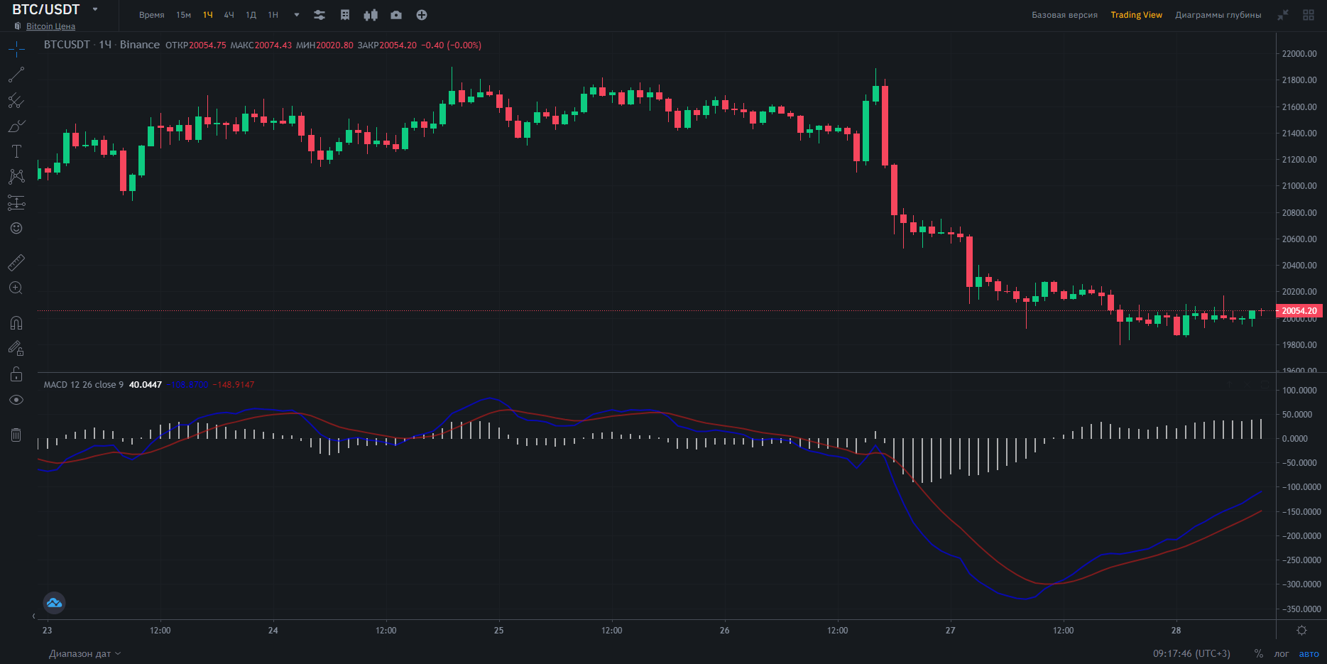 - Трендовые. Исследуют исторические котировки и в разрезе текущего развития ситуации показывают, в каком направлении будет двигаться актив. Взглянув на них, трейдер может сделать вывод, имеется ли в изучаемом токене тренд, и в каком направлении он будет развиваться. Ниже приведен часовой график пары BTC/USDT с наложенными скользящими средними линиями интервалом 25 и 9. Когда котировки находятся под его линиями, имеем тренд на понижение, в противном случае – работаем на растущем рынке. Поэтому вопрос как использовать их на практике не вызывает особых проблем даже у новичков.
