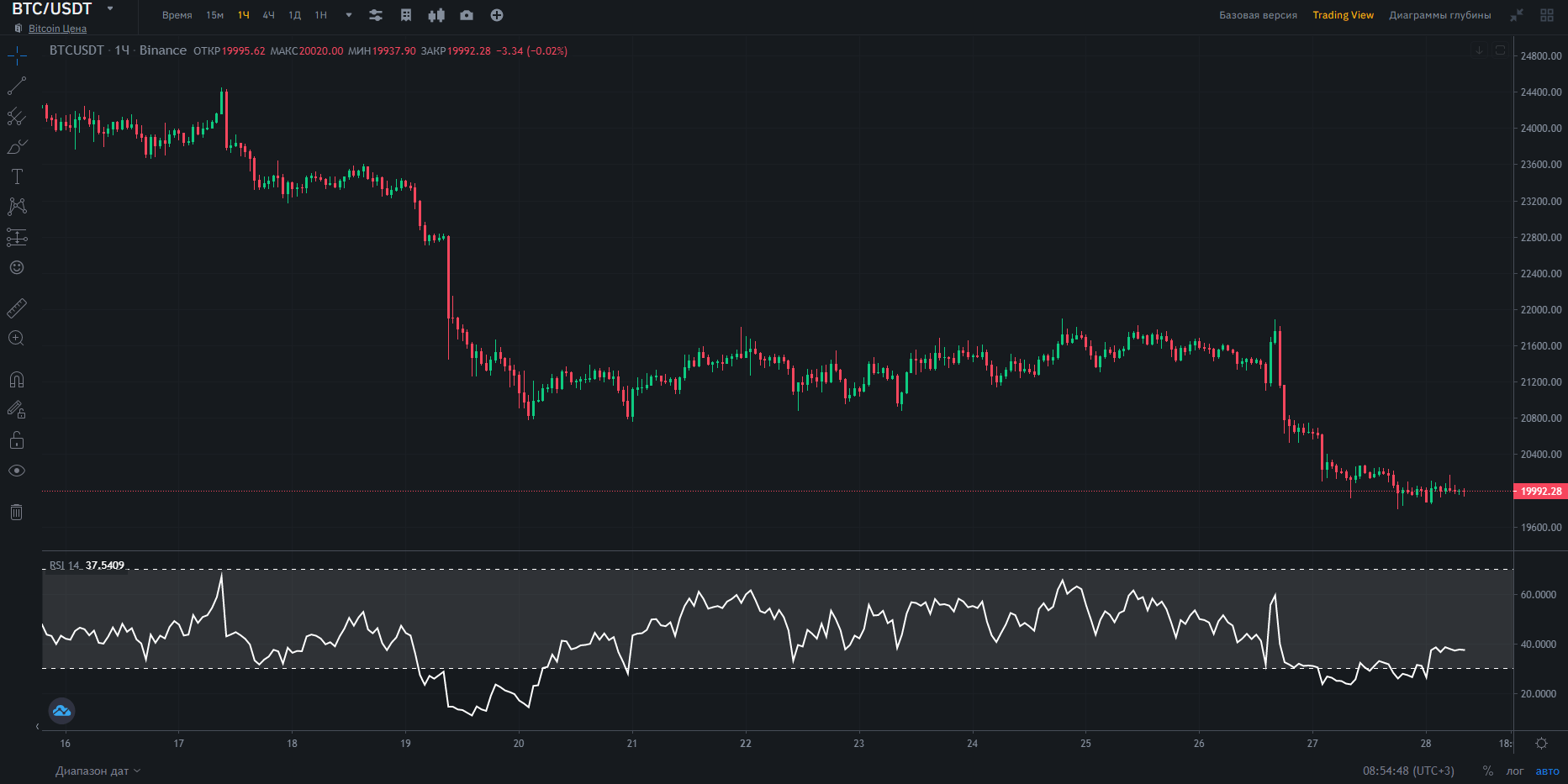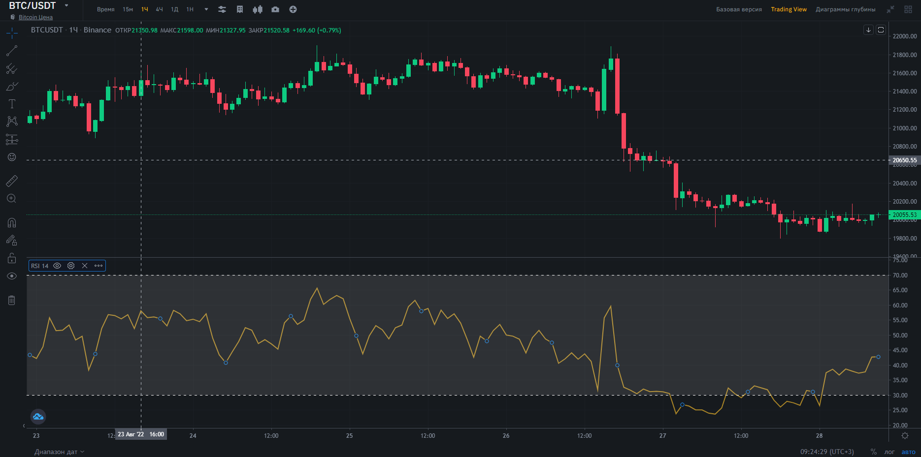 - Осцилляторы. Отображают текущее состояние цен по отношению к тому, где они находились ранее. Чаще всего используются для идентификаций экстремальных состояний – перекупленности, когда тренд с высокой вероятностью может начать разворот из-за исчерпания бычьих настроений среди биржевиков, и перепроданности, обратному состоянию. Ниже на рассмотренной ранее паре BTC/USDT рассчитан индекс относительной силы, показатели которого представлены в окне ниже.