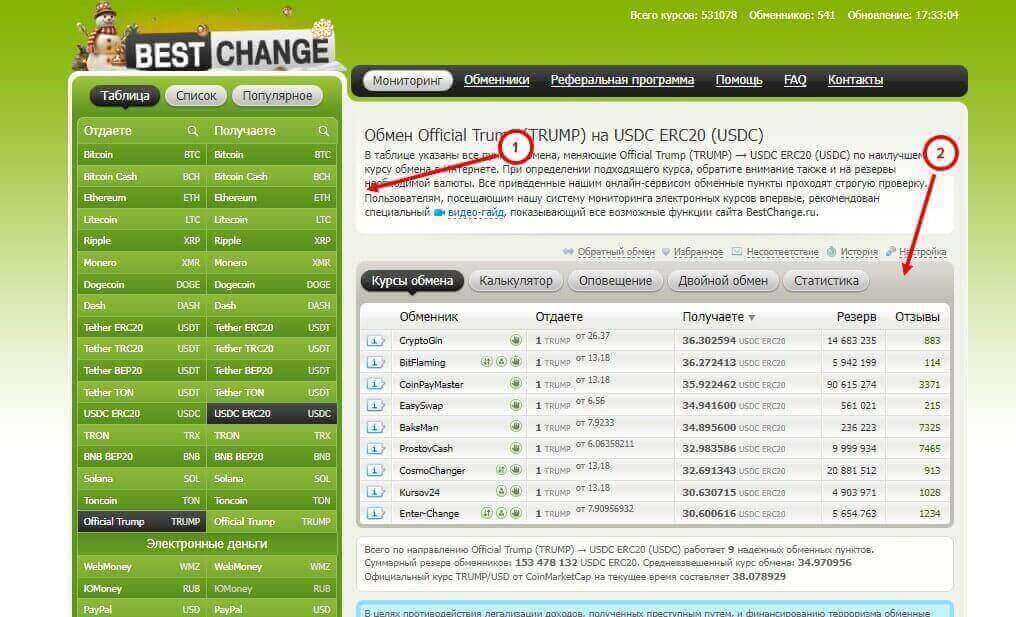 - Процедура покупки через обменники начинается с выбора надежного сервиса, который поддерживает обмен рублей на Trump Coin. Важно уделить внимание репутации обменника, отзывам пользователей и комиссии за обмен, чтобы избежать возможных потерь и мошенничества. В качестве варианта можно воспользоваться агрегатором BestChange для поиска лучшего курса.