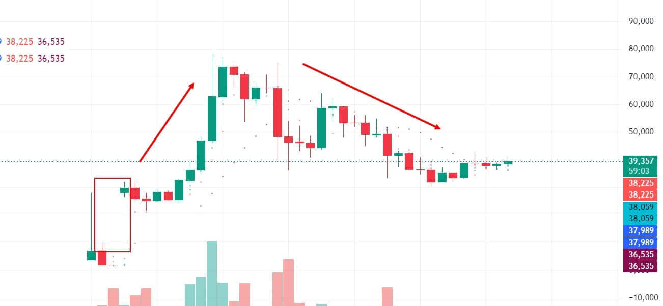 Учитывая график монеты, многие пользователи смогли заработать приличные деньги, купившие токен прямо на старте проекта – максимальный курс доходил до 78 долларов за монету при начальной цене в 3,8 – 10 USDT (780 – 2052% роста за 19 часов после запуска). Затем курс начал откатываться вниз и консолидируется в районе 30 – 41 USDT за токен. Следует отметить ГЭП в самом начале графика на бирже MEXC в районе 10 и 28 USDT, которые в будущем возможно будут закрывать возвращением цены к тем же отметкам.