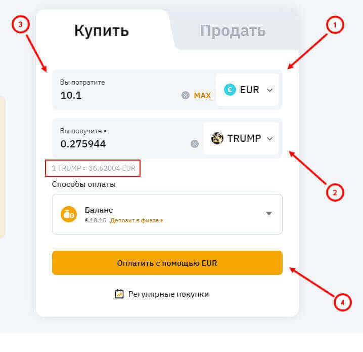 - Затем нужно выбрать любой фиат, имеющийся на счету и во втором поле выбрать криптовалюту “TRUMP”. Ознакомьтесь с курсом, укажите сумму в одном из полей и нажмите на кнопку “Оплатить с помощью EUR” или любой другой валюте.