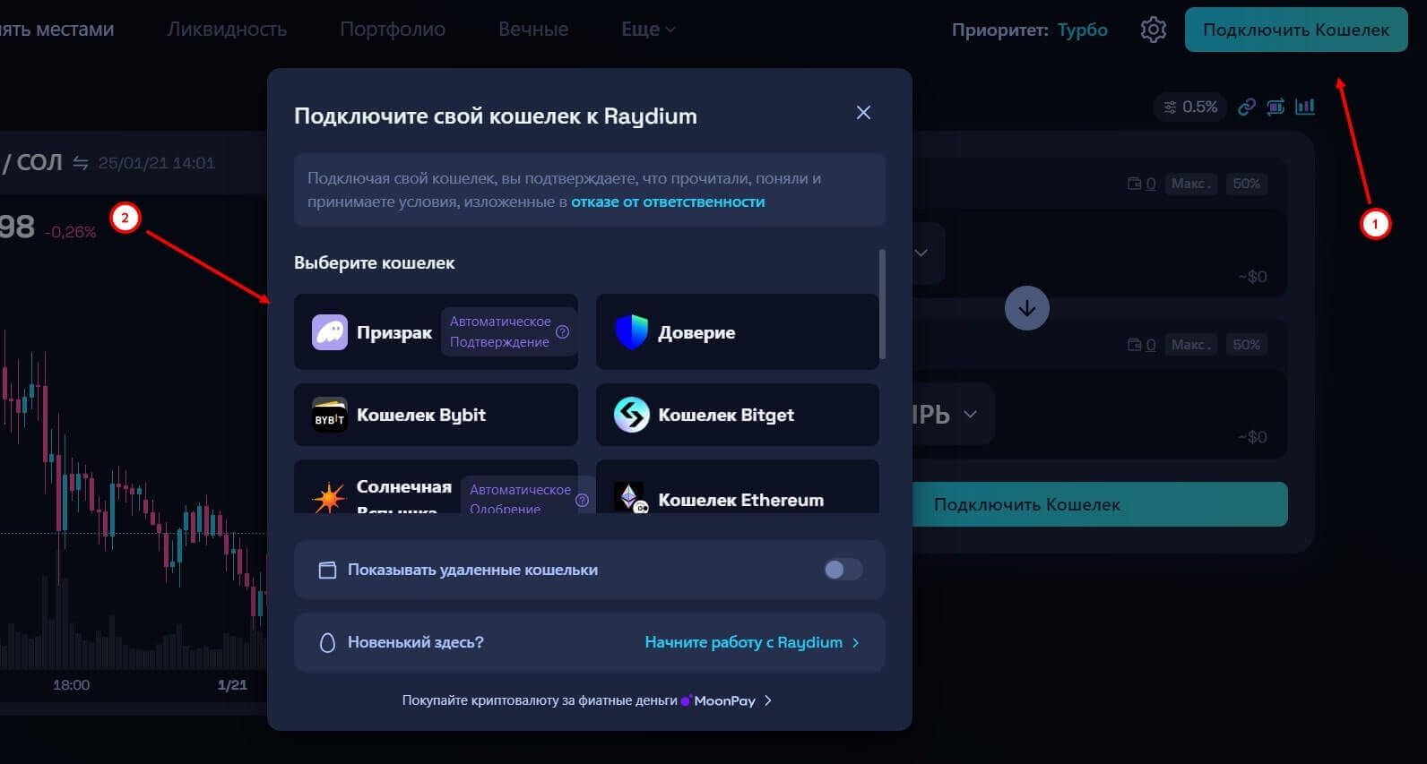 - Подключите кошелек, где находятся монеты Solana, чтобы начать торговать на DEX.