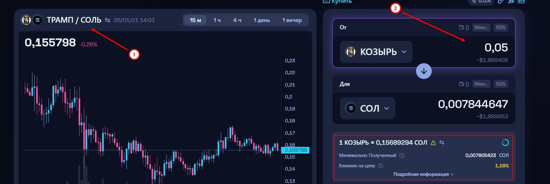 - На DEX площадке вам нужно будет найти пару Trump coin к SOL, указать количество токенов, ознакомится с курсом и выполнить обмен, подтвердив операцию в вашем кошельке. Операция обмена обычно занимает всего несколько минут.