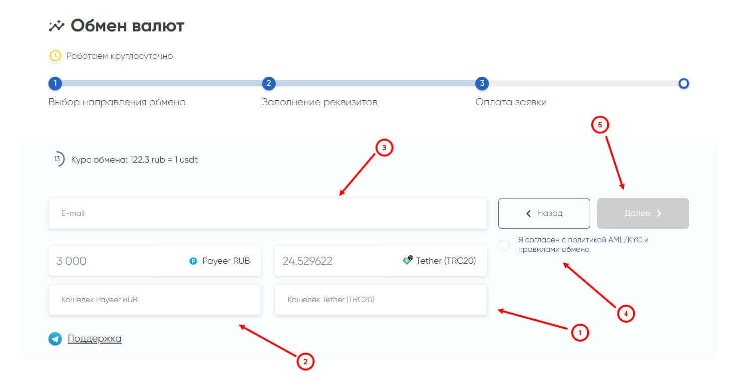 - Далее пользователю следует указать адрес криптовалютного кошелька для получения USDT, реквизит, с которого будет отправлены средства и контактную информацию (адрес электронной почты, номер телефона или ник в телеграмме) и согласится с политикой AML/KYC.