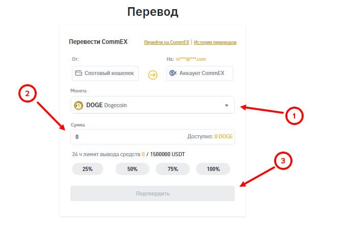 Затем выбираете актив, который желаете перенести и сумму. После этого нажмите на кнопку “Подтвердить”, чтобы осуществить перевод USDT или других активов между кошельками на спотовый кошелек Коммекс.