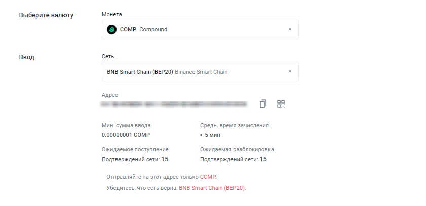 В самом начале необходимо на сайте CommEx в разделе “ввод” указать монету, сеть и автоматически произойдет создание кошелька, который нужно скопировать – он нам понадобиться дальше.