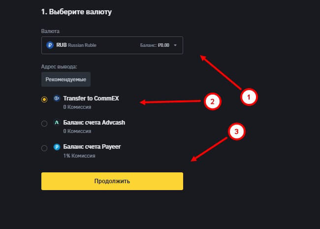 Чтобы совершить прямой перевод рублей или криптоактивов с Бинанс на биржу Коммекс, необходимо перейти в раздел “вывод фиата”, после чего появится список электронных кошельков, в т.ч. Transfer to CommEx. Выбираете его, и нажимаете на кнопку “Продолжить”.