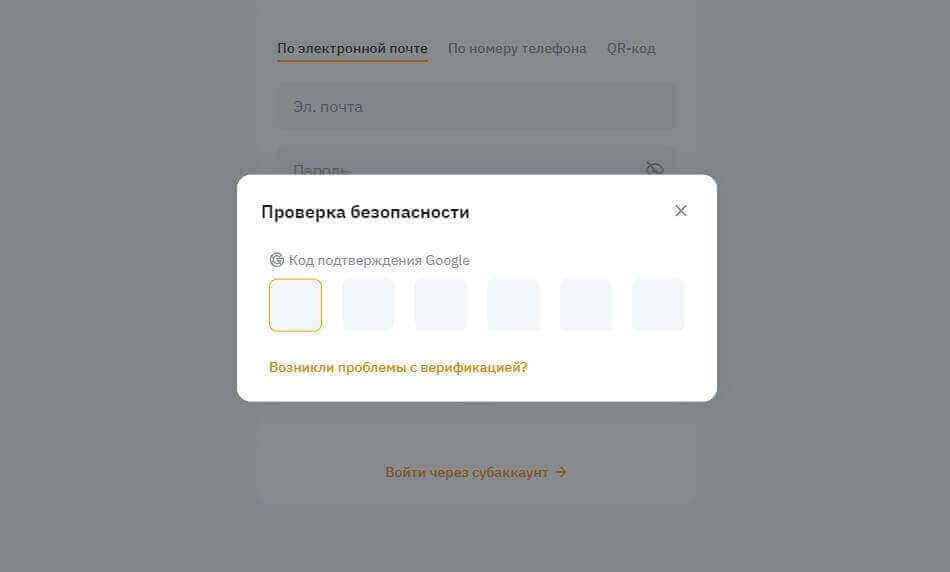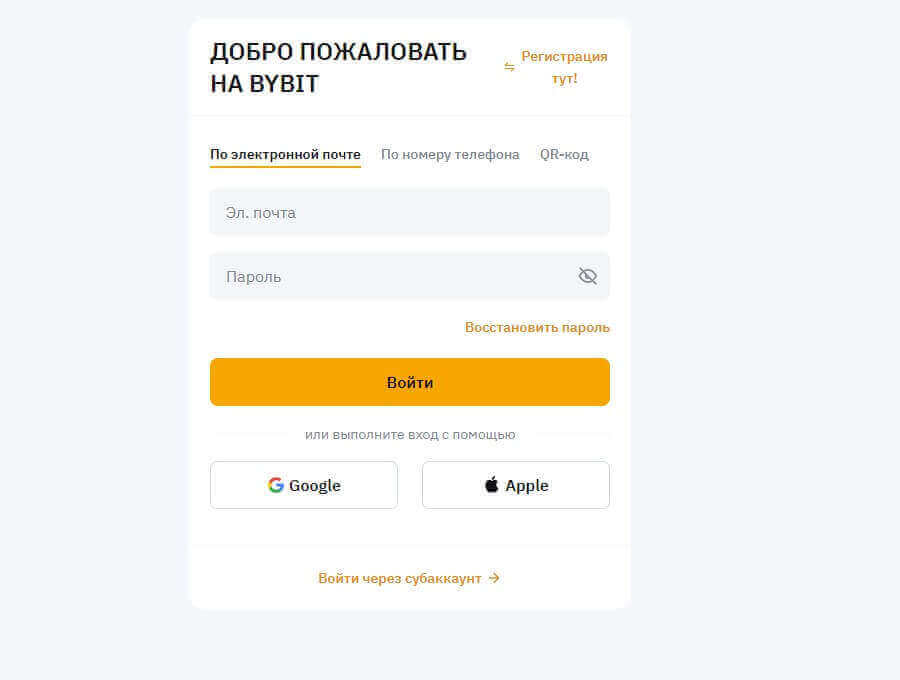 Авторизуйтесь в открывшейся привычной форме криптовалютной биржи ByBit, используя пары email-пароль, телефон-пароль, либо qr-код или же Google аккаунт/Apple ID аккаунт.
