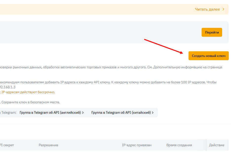 - Зайдите в свой аккаунт, наведите на значок профиля и во всплывающем меню выберите «API». В разделе API управления создайте новый ключ, выбрав «Создать новый ключ».