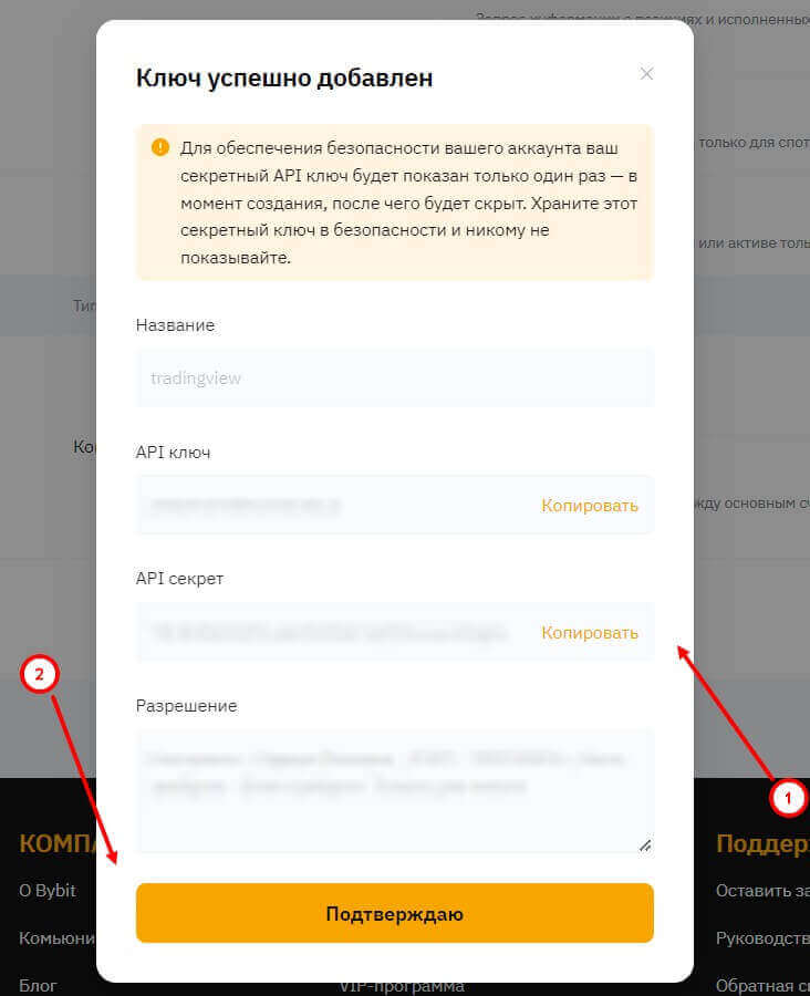 - Затем появится уведомление о том, что ключ был успешно добавлен. Запишите API-ключ, API-секрет и нажмите на кнопку “Подтверждаю”.