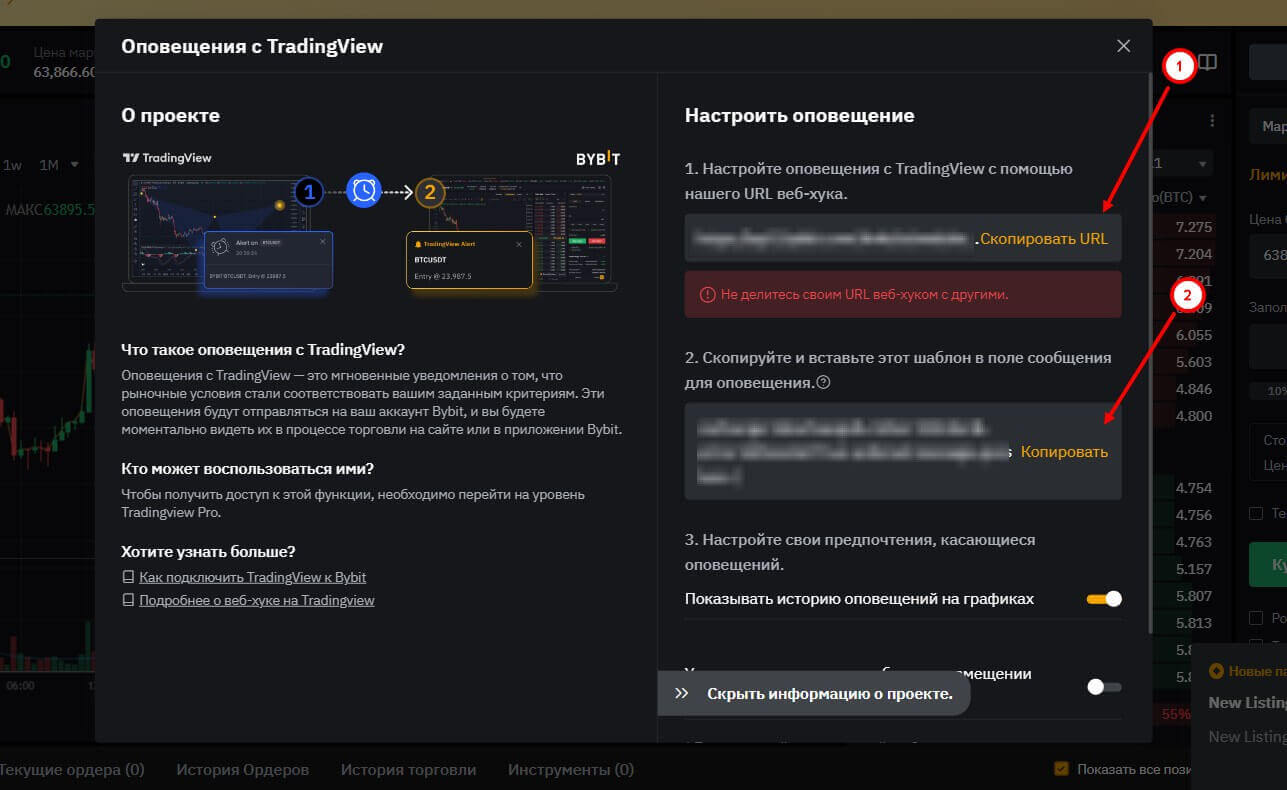 В окне на криптовалютной торговой площадке Bybit появится адрес веб-хука и специальный шаблон с сообщением – обязательно копируем их.