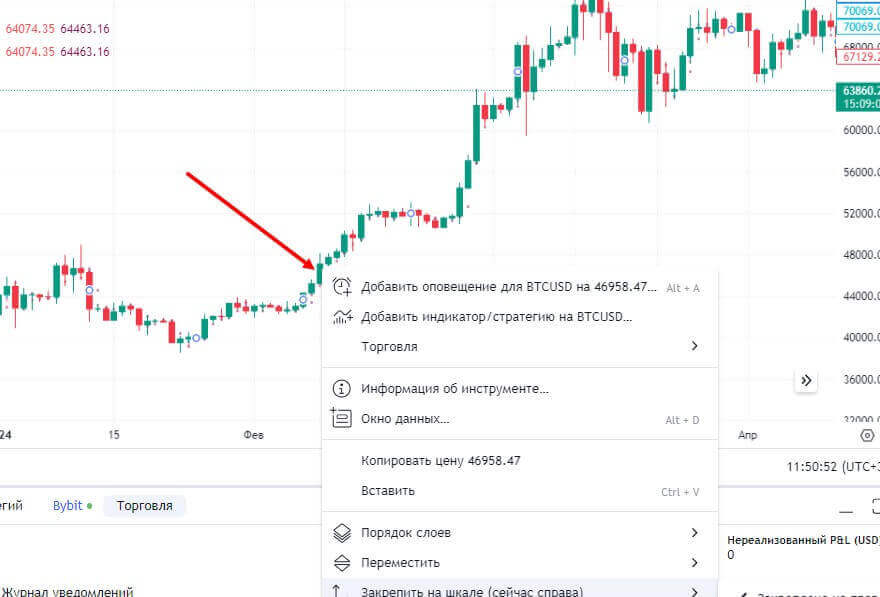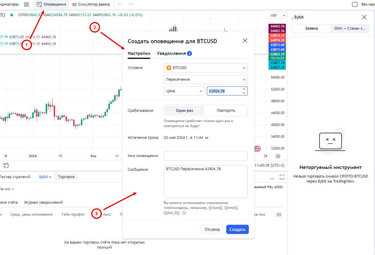 - Синхронизация Bybit с TradingView также позволяет трейдерам оперативно реагировать на изменения рынка. Они могут настроить оповещения на изменение цен или индикаторов и получать их прямо на свои устройства, что позволяет быстрее принимать торговые решения. Кроме того, для удобства управления рисками, могут быть настроены предварительные параметры заявок, включая стоп-лоссы и тейк-профиты, которые автоматически синхронизируются с торговым терминалом Bybit.