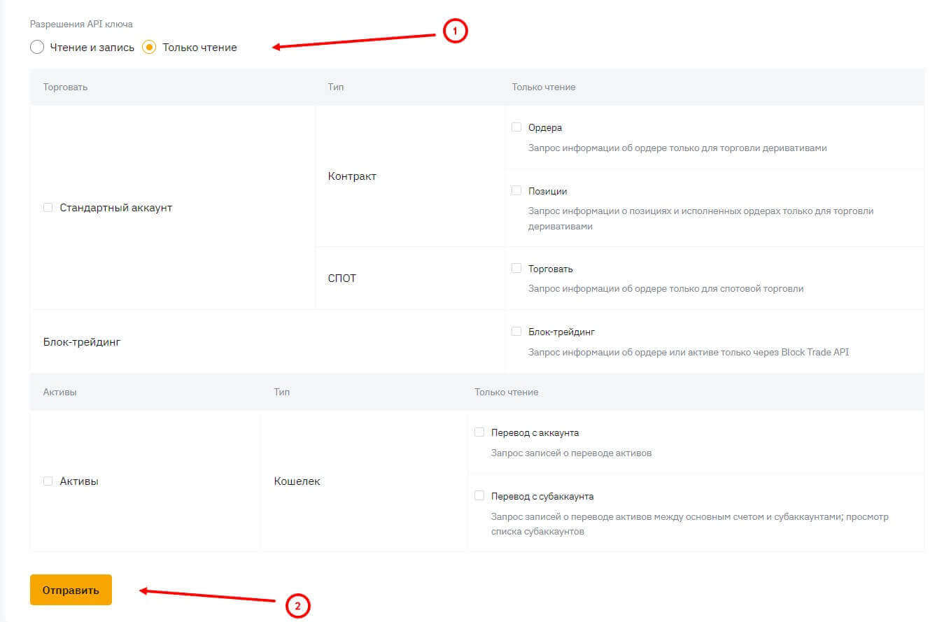 - При создании ключа активируйте необходимые разрешения для торговли, если планируется использовать TradingView для совершения сделок и нажмите на кнопку “отправить”.