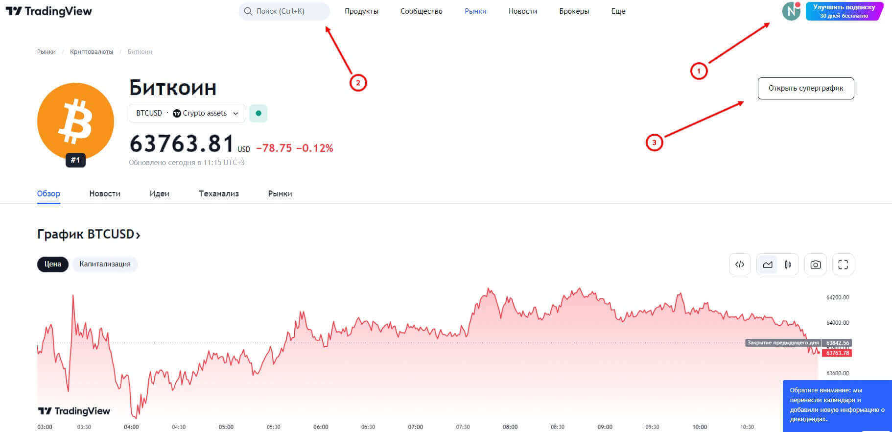 Первое, что необходимо сделать – перейти на сайт TradingView и зайти в свой аккаунт, используя аккаунт Google, или указав регистрационные данные. Затем укажите в поиске тикер актива и выберите его из списка. Откройте суперграфик нажав на кнопку “Открыть суперграфик”.