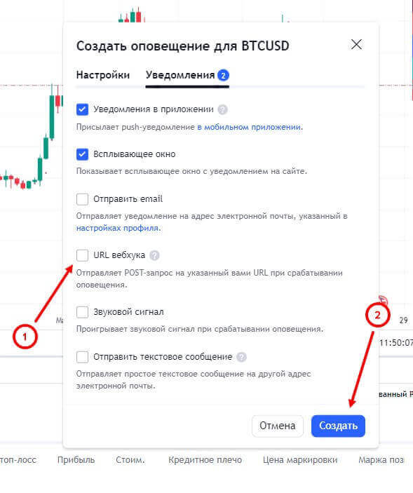 Ставим необходимую галочку в пункте “URL веб-хука” Затем вставляем с помощью клавиш Ctrl+V адрес веб-хука в опции «Уведомления» и кликаем на «Создать».