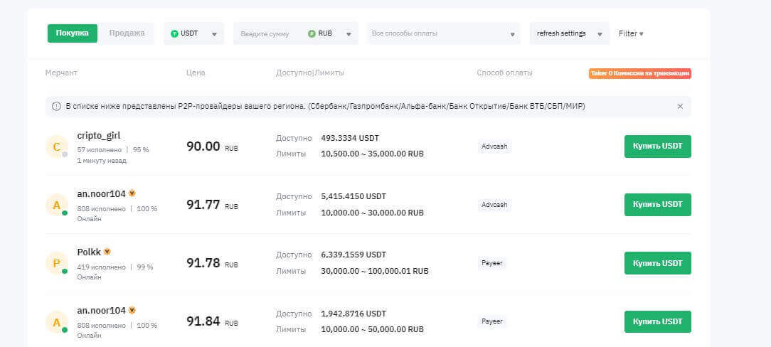 В открывшейся странице нужно выбрать пункт “Покупка”, выбрать крипту, укажите сумму и способ оплаты. Затем появиться список тех вариантов, подходящие под ваши критерии. Нажмите на “Купить USDT”, если был выбран стейблкоин Tether USD и укажите сумму, готовую к инвестициям.