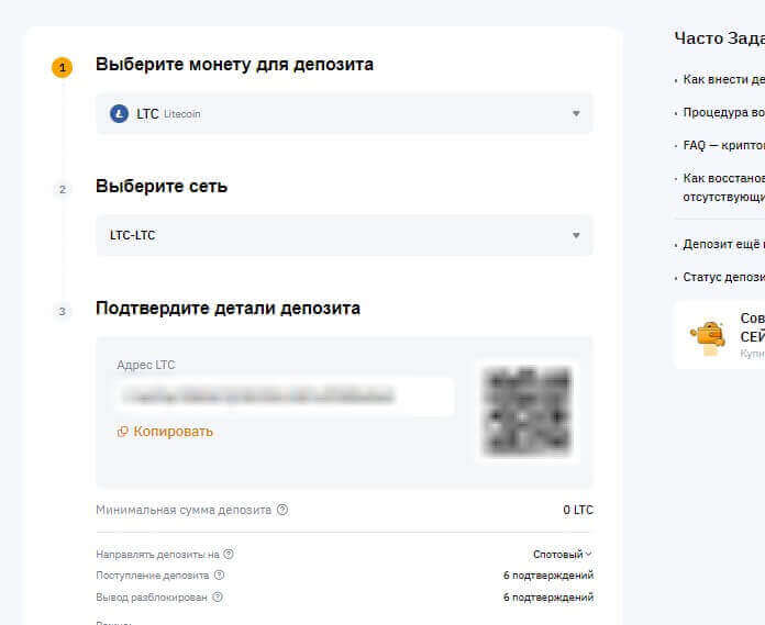 Затем выбираете монету LiteCoin и сеть, по которой пройдет транзакция. Затем появиться кошелек, который и нужно скопировать.