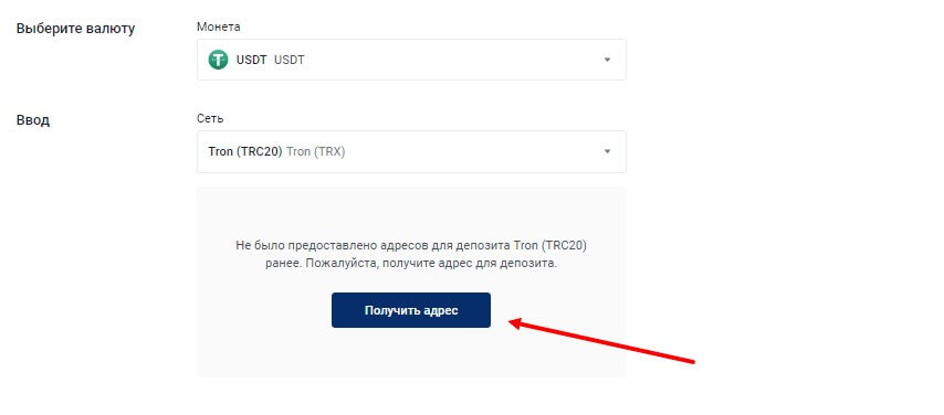 После выбора исходных данных, запросите адрес перевода, нажав на кнопку “Получить адрес”.