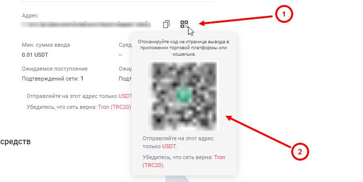 Появится адрес, куда нужно совершить перевод на необходимую сумму. Ниже адреса кошелька можно увидеть минимальную сумму вводу и через сколько подтверждений придет криптовалюта на счет. Если перевод осуществляется с помощью онлайн или десктопного кошелька, то можно скопировать нажав на кнопку.