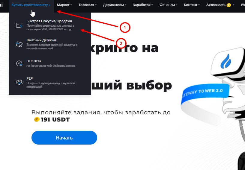 Чтобы сделать это выберите разделы “Купить криптовалюту” – “Быстрая покупка/продажа”.
