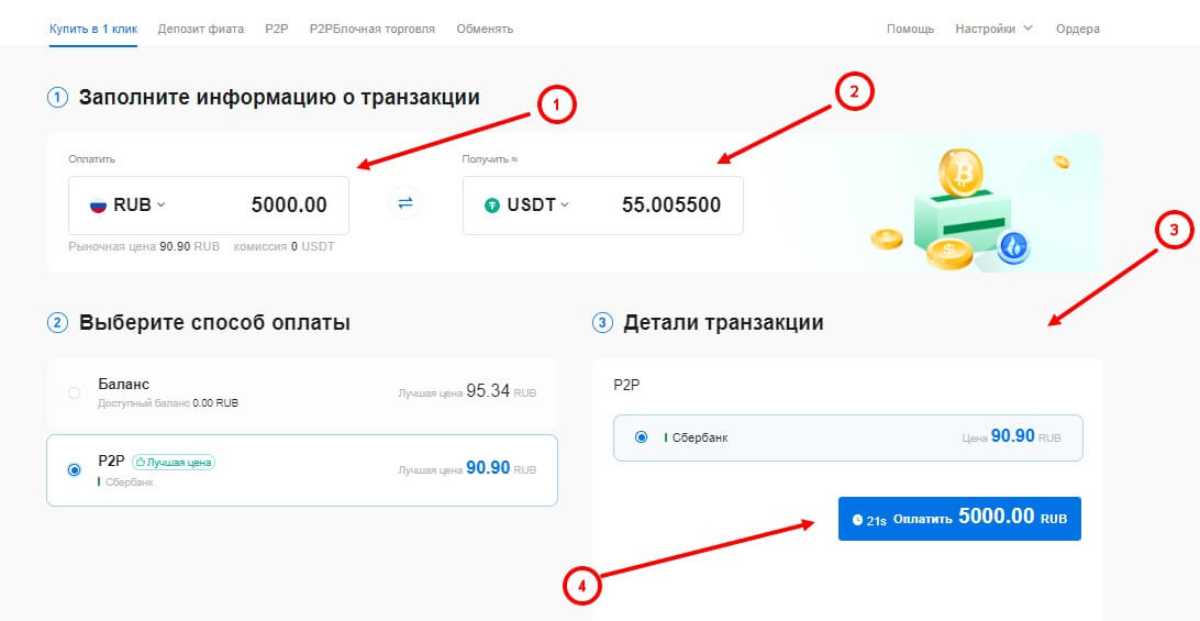 Выберите фиатную и цифровую валюту, которую хотите обменять, способ оплаты (P2P или с баланса). Затем в блоке “Детали транзакции” вы сможете увидеть лучшие предложения. На формирования оплаты 50 секунд, а затем нужно обновить сумму получаемой криптовалюты или же сумму фиатной валюты, готовую отдать взамен. Для перехода на страницу по оплате заявки, выберите куда хотите перевести и нажмите на кнопку “Оплатить”.