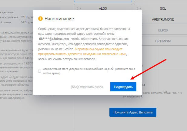 Откроется окно, где нужно нажать на “Подтвердить”, если на почту пришел адрес, куда нужно выполнить перевод.