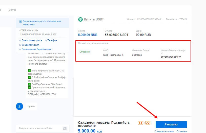 На новой странице будет указано, куда необходимо совершить перевод. Учтите – на проведение платежа у пользователя 15 минут. Необходимо нажать на кнопку “Я оплатил” после перевода криптовалюты.