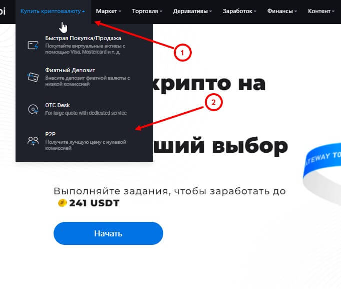 Чтобы перейти в раздел питупи торговли, необходимо выбрать пункт “Купить криптовалюту” – “P2P”. Откроется новая страница, где происходит процесс приобретения цифрового актива, который может в дальнейшем использоваться для проведения торговых операций.