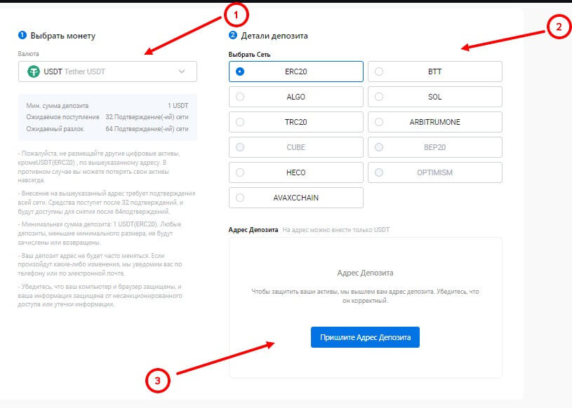 Нужно выбрать пополняемую монету и сеть. Затем нажмите на кнопку “Пришлите адрес депозита”.