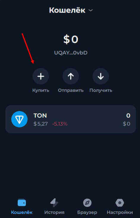 Пополнение через кошелек напрямую позволяет купить актив в виде TON по наиболее оптимальному курсу. Чтобы сделать это, нужно в самом начале перейти в раздел “Купить”.