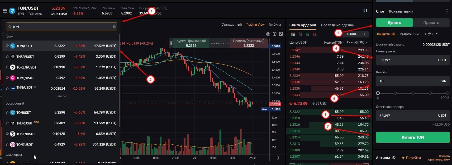 На странице нужно вбить в поиск название монеты TON и выбрать торговую пару TON/USDT. Затем выберите “Купить” в правой части экрана, укажите сумму ордера (можно выбрать рыночный ордер для мгновенной покупки по рыночной цене) и количество монет. Ниже выйдет полная стоимость ордера без учета комиссии, которая будет списана с покупаемой криптовалюты. Для завершения нажмите на кнопку “Купить TON”.