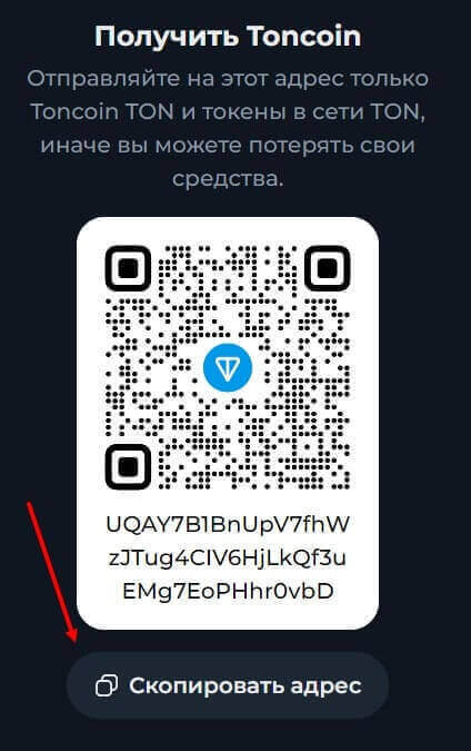 Затем нужно скопировать адрес в открывшейся странице кошелька нажав на соответствующую кнопку.