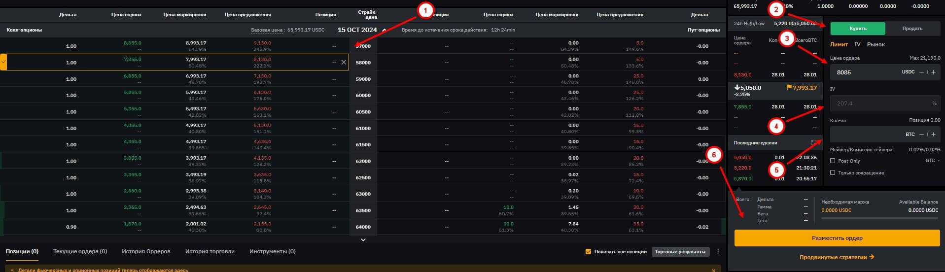 В таблице ниже сортировка контрактов происходит по Strike Price. Выбираем необходимый для вас и нажимаем на него. В правой части страницы появится форма для оформления ордера. Нужно указать направление – «Купить» или «Продать», цену вашего ордера и необходимое количество. После этого перепроверьте указанное и нажмите на кнопку “Разместить ордер”.