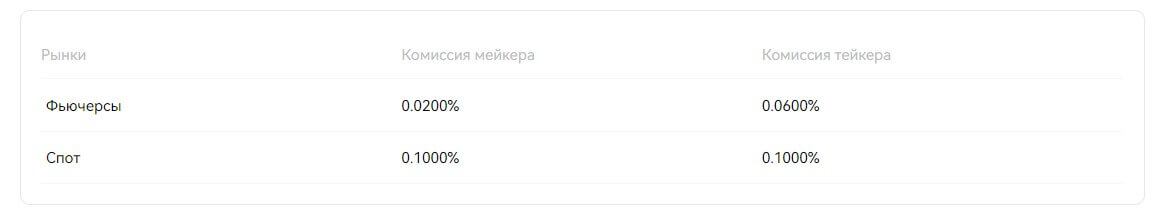 Основа в структуре комиссий – базовые сборы, которые применяются для всех пользователей с небольшим объемом торгов и новичков, зарегистрированных на официальном сайте. На фьючерсном рынке размер комиссии равен 0,02% для мейкеров и 0,06% для тейкеров. Если желаете перейти торговать на спот, то комиссия немного выше – 0,1% для мейкеров и тейкеров.