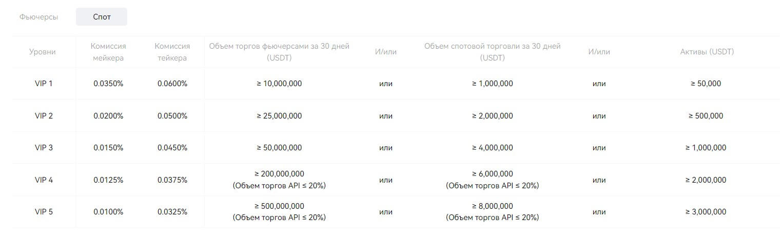 Минимальный уровень VIP1 позволяет получить скидку для мейкера на 70% (0,006%) и на 16% для тейкера (до 0,05%) при объеме по фьючерсам до 10 миллионов, на споте до 1 миллиона или при наличии активов на сумму от 50 тыс. долларов. При этом максимальная скидка равна в 100% для мейкеров доступна на последнем 5 уровне.