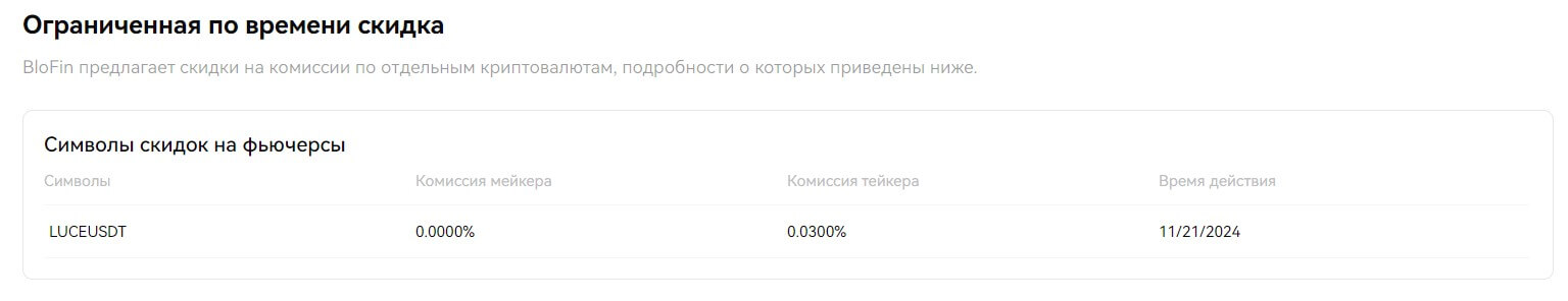 Ежемесячно биржа предоставляет возможность получить пользователям временные скидки на определенные токены для торговли на фьючерсном рынке. Участие могут принять все пользователи, даже только зарегистрированные участники торгов. В таблице указывается символы, комиссии для тейкеров и мейкеров и срок действия скидки.