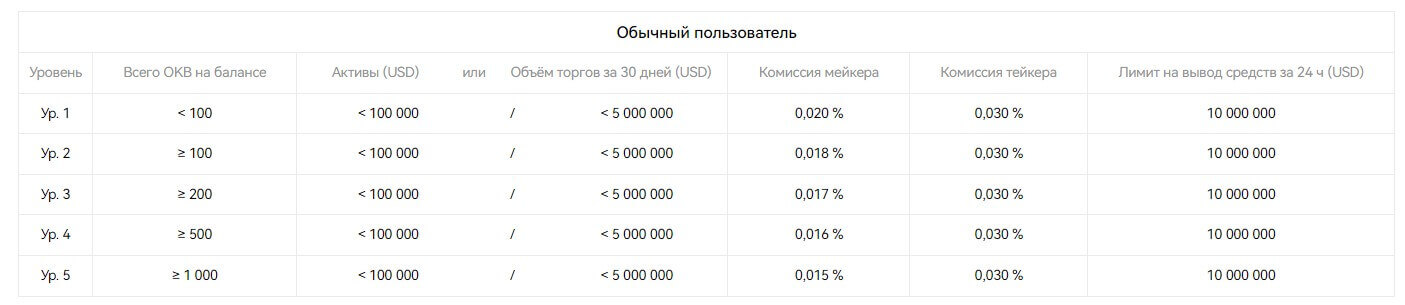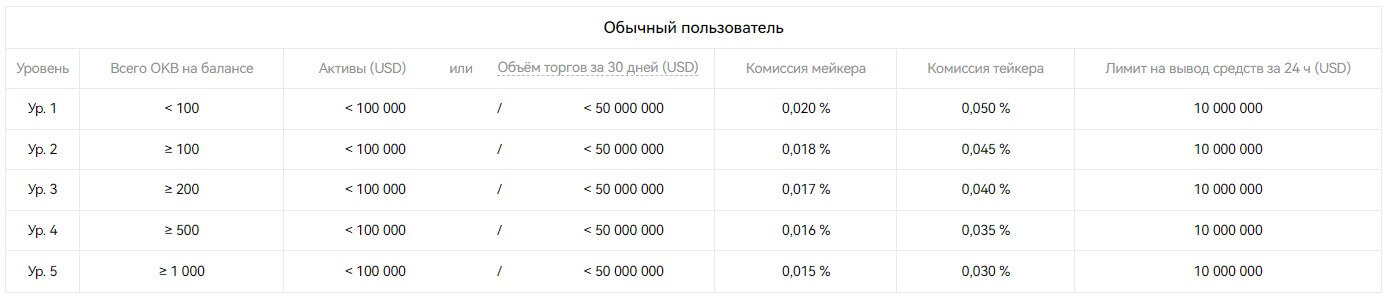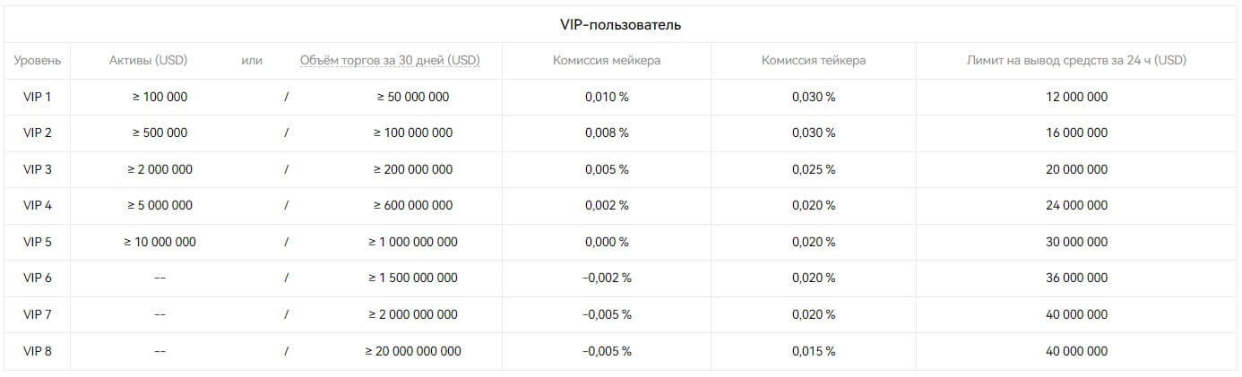 Для VIP пользователей нужно выполнить одно из условий: сумма активов или объем торгов за 30 дней в USD. Для обычных трейдеров комиссия выглядит следующим образом: