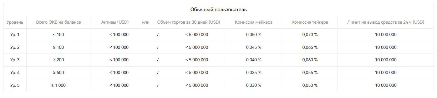 Важно учесть то, что в паре с USDC, DAI, BTC, ETH, OKB, DOT, EURT комиссия меньше и составляет до 0,05% для мейкеров и до 0,07% для тейкеров. Комиссии подразделяются на обычные уровни и VIP. Основными требованиями для обычных пользователей для уменьшения сборов считаются:
