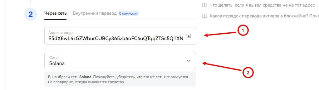 - Укажите номер кошелька, на который нужно будет произвести вывод средств и выберите сеть (если она не была распознана системой автоматически);