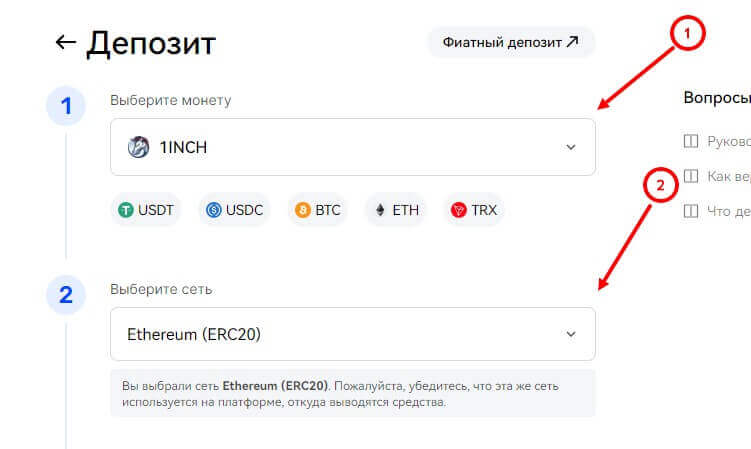 - Укажите монету и сеть, по которой будет проводиться транзакция;