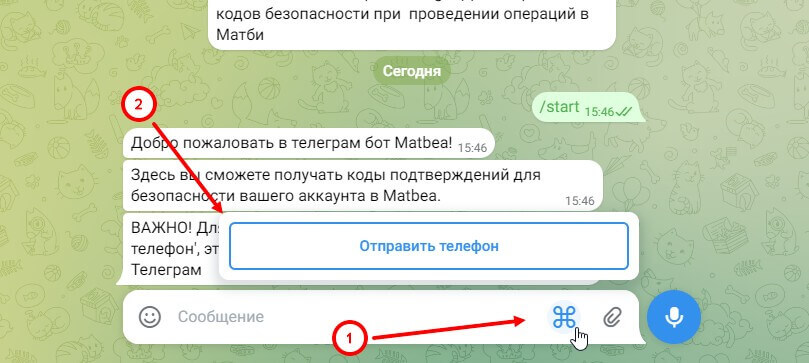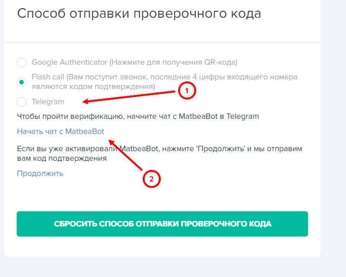 Также можно настроить подтверждение авторизации и операций через телеграмм. Для того чтобы сделать это, следует нажать на пункт “Telegram”. Откроется информация, в которой будет сказано о том, что верификация будет проводиться через чат-бот в MatbeaBot в Telegram, где нужно нажать на пункт “Начать чат с MatbeaBot.
